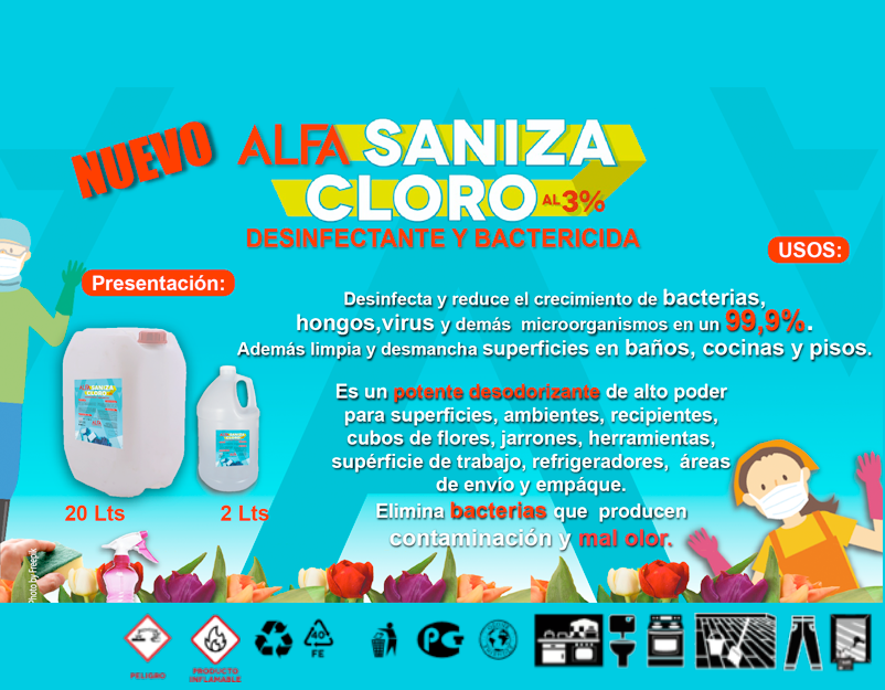 Diluir 60ml de Cloro Saniza Alfa en un litro de agua.